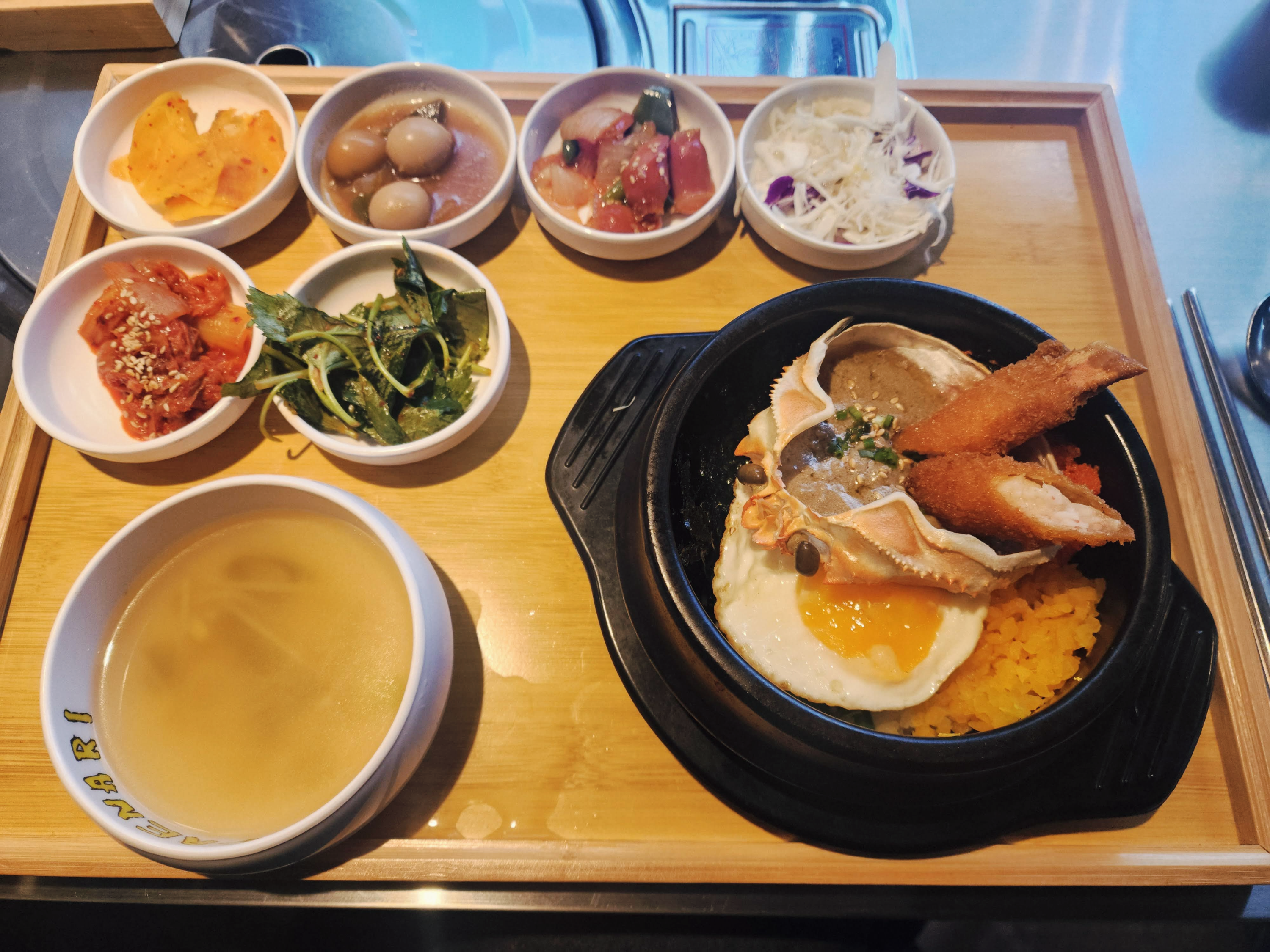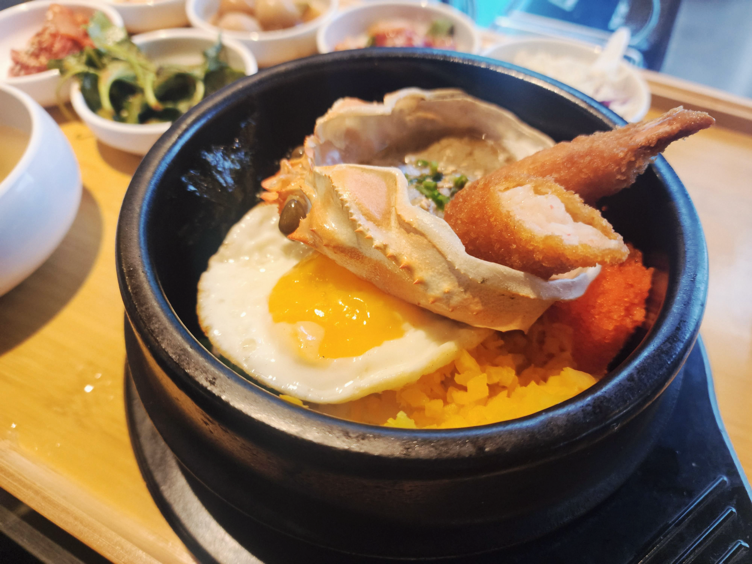 실내는 차가운 금속 테이블과 짙은 색의 고가구풍 의자가 묘한 대조를 이룬다. 천장을 가로지르는 트랙 조명과 매달린 노란 꽃장식들이 어우러져 현대적이면서도 아늑한 이중적인 분위기를 연출한다. 점심 메뉴인 ‘대게 딱지장 알밥 정식한상’은 정갈한 나무 쟁반에 차려져 나온다. 뜨거운 돌솥 위 신선한 계란 노른자와 날치알, 그리고 대게 딱지장이 듬뿍 담긴 게 껍데기가 올라 있다. 게 껍데기 속 깊고 크리미한 맛의 딱지장을 밥에 비비면, 계란 노른자의 부드러움과 어우러져 풍부한 감칠맛을 완성한다. 여기에 날치알의 톡톡 터지는 질감과 함께 바삭하게 튀겨낸 새우튀김이 더해져 식감의 변주를 준다. 함께 제공되는 간결한 반찬들은 자칫 무거울 수 있는 게장 비빔밥의 맛을 균형 있게 잡아준다.** 친절한 접객, 깔끔한 식사.