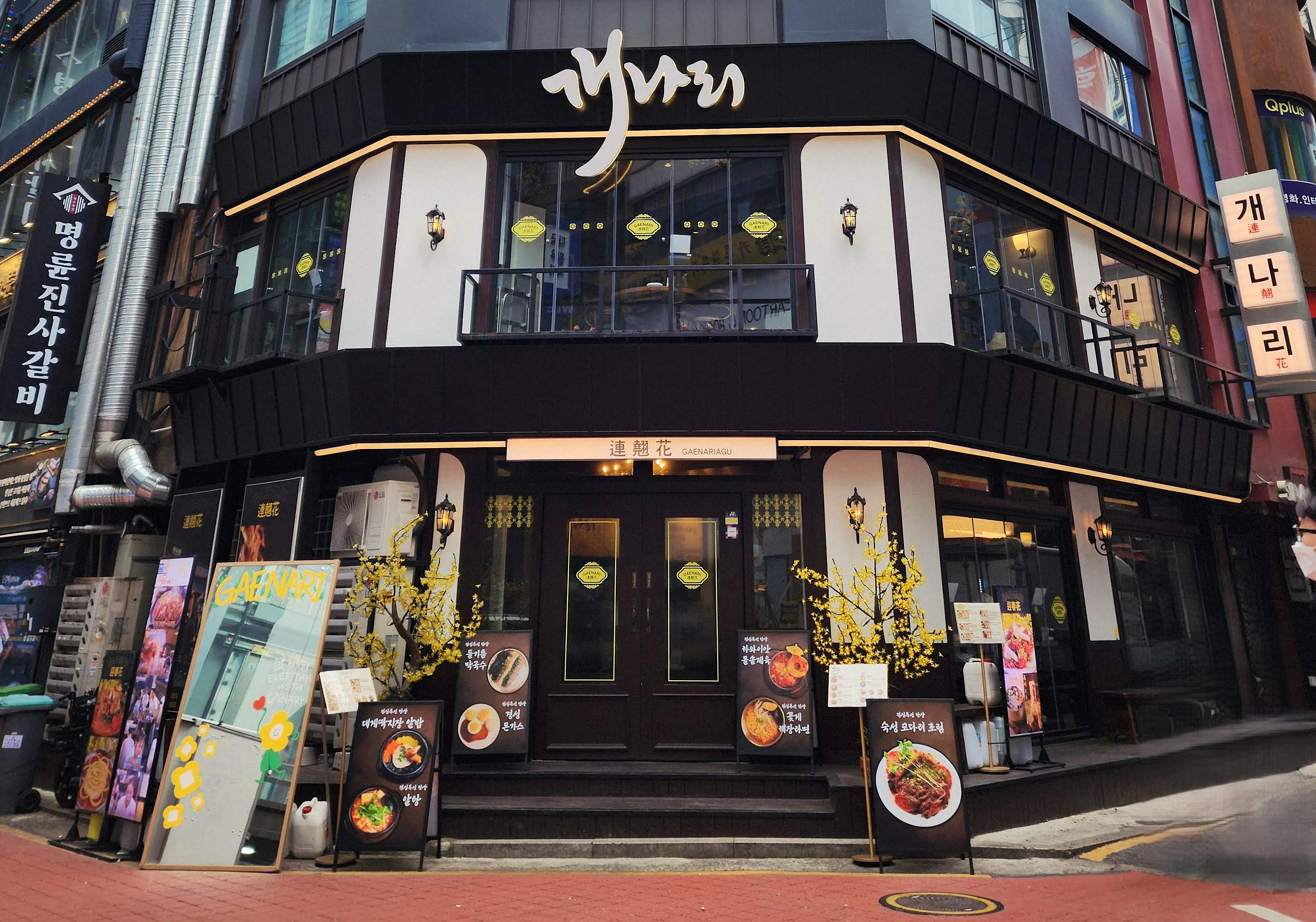종로 한복판, 검은색과 흰색의 대비가 돋보이는 외관은 현대적이면서도 예스러움을 동시에 자아낸다. 노란 조명과 입구 곳곳에 놓인 노란 개나리 조화 장식이 따뜻한 첫인상을 만든다.
