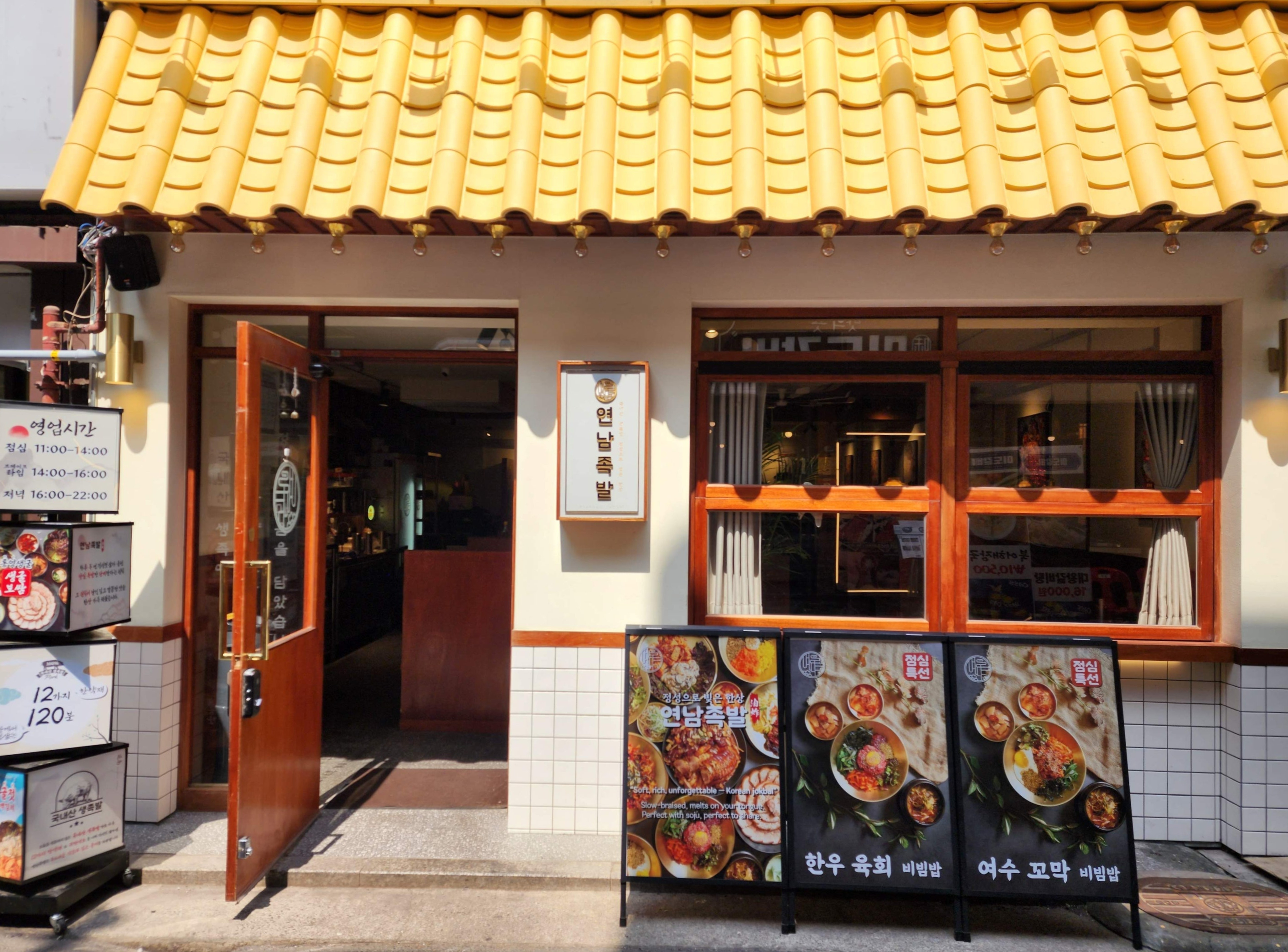 젊음의 거리 중심부에 자리한 연남족발, 노란색 기와지붕과 흰색 타일로 마감한 외관이 선명한 인상을 준다.