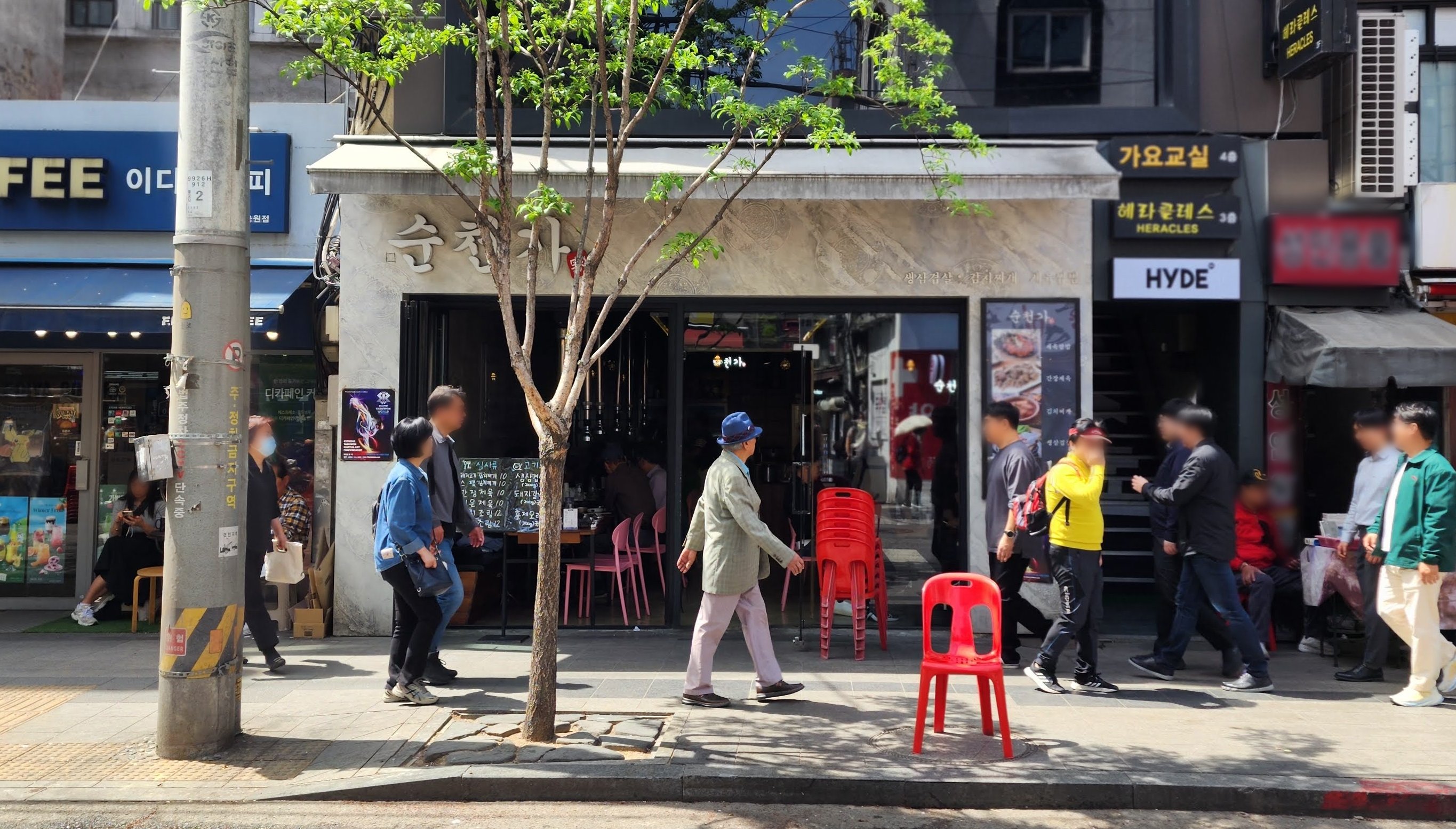 거친 석재 질감을 살린 외벽과 검은색 철제 프레임이 조화를 이루는 차분한 파사드. 입구 옆 투박하게 적어 내려간 손글씨 메뉴판은 종로 송해길 특유의 정겨운 분위기를 고스란히 담아낸다.